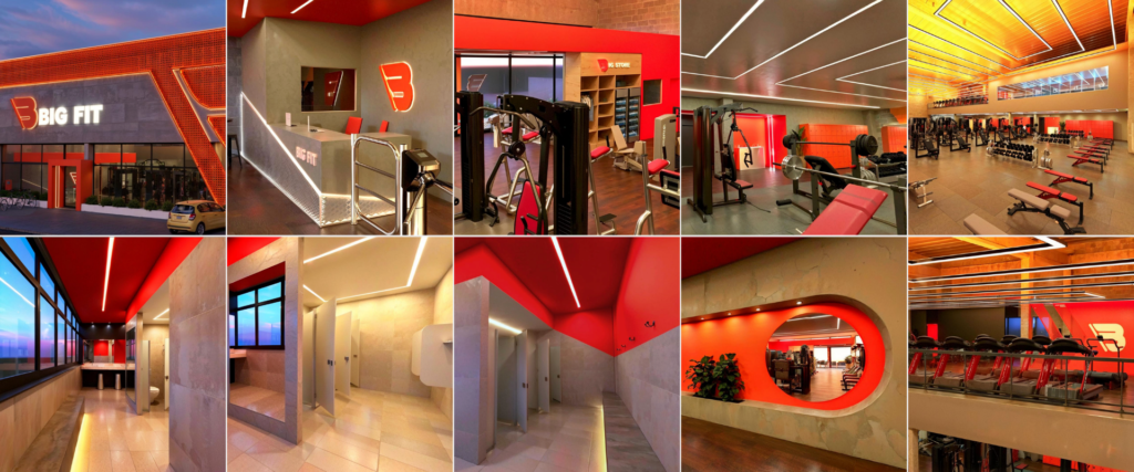 No desenvolvimento do projeto para a Big Fit, a arquitetura foi orientada pela experiência do usuário. O conceito utilizou cores intensas, iluminação linear e elementos arquitetônicos marcantes para estruturar uma atmosfera alinhada à prática do treinamento físico.