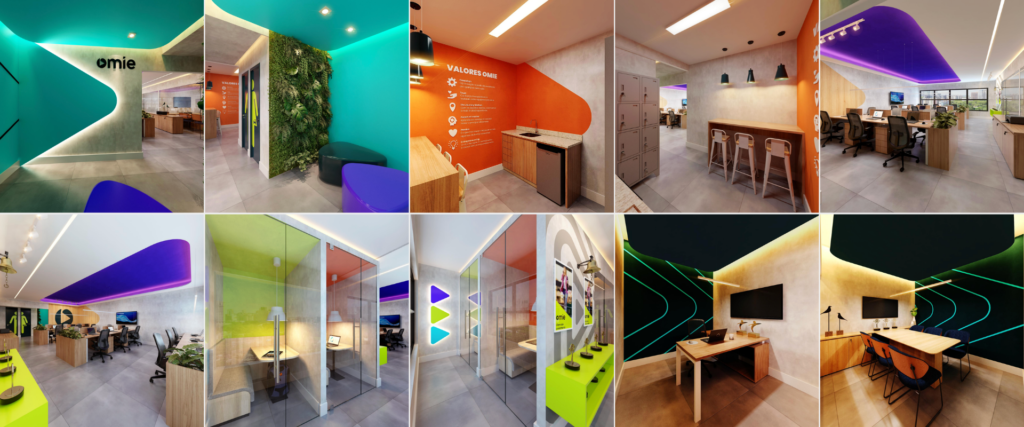 No trabalho desenvolvido para a Omie, o conceito foi estruturado para permitir a padronização de escritórios da marca. Elementos gráficos derivados do símbolo institucional foram incorporados à arquitetura, criando uma linguagem visual reconhecível e replicável.
