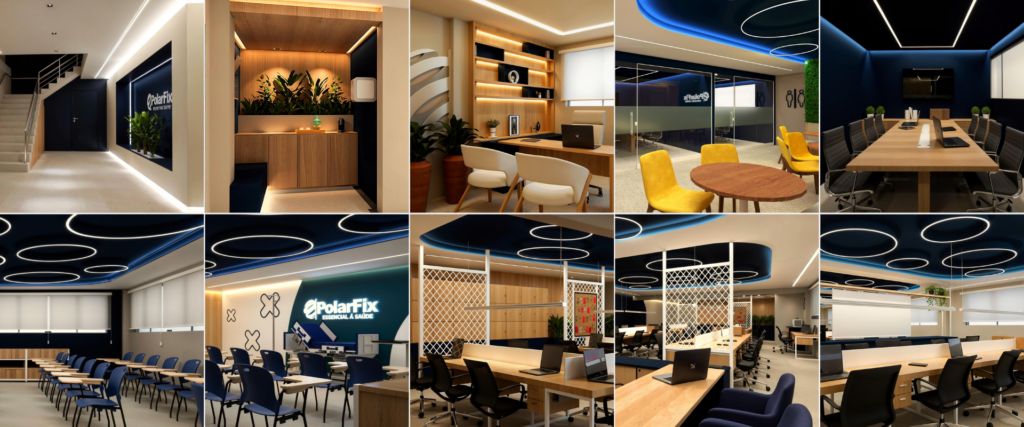 Além disso, a proposta utilizou materiais neutros, layout flexível e soluções biofílicas para garantir adaptabilidade a diferentes espaços físicos.